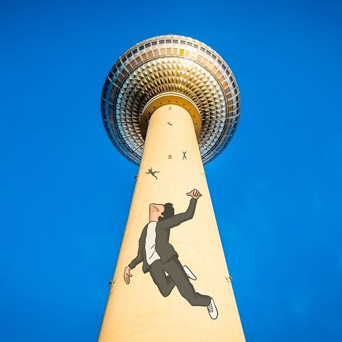 Он добавляет популярных персонажей, гигантские продукты питания или забавные рисунки, которые вписываются в реальные фотографии, превращая здания и улицы во что-то весёлое и неожиданное.