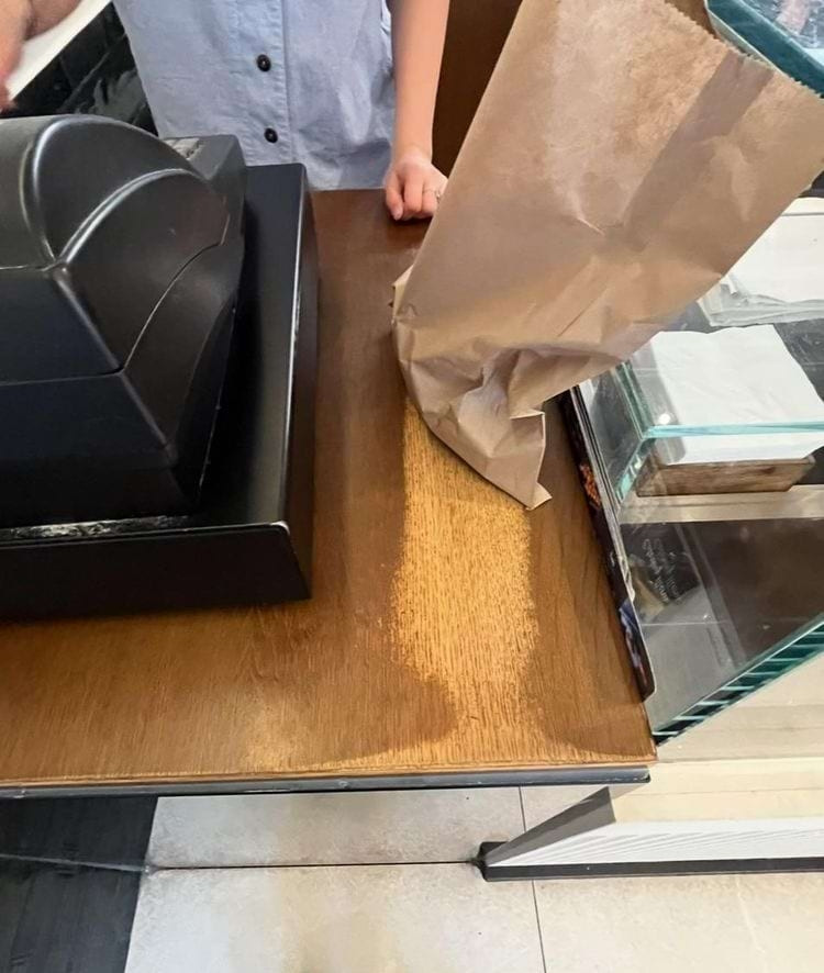 Прилавок в магазине, где по блестящей, протёртой дорожке изо дня в день скользят пакеты с покупками. Сколько лет — столько движений, почти одинаковых.
